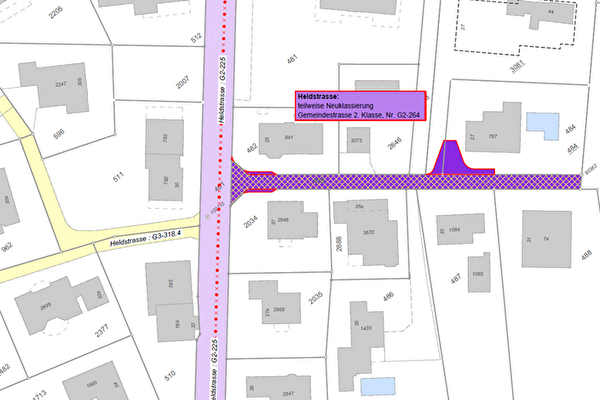 Auf einem Teil des Grundstücks Nr. 484, Heldstrasse 27, ist ein Neubau vorgesehen. Um in diesem Zusammenhang die hinrei­chende Erschliessung sicherstellen zu können, sind ab der Heldstrasse einerseits kleine bauliche Anpassungen vorzunehmen und gleichzeitig ist die heutige Gemeindestrasse 3. Klasse (G3-318) in die 2. Klasse (G2-264) umzuteilen.